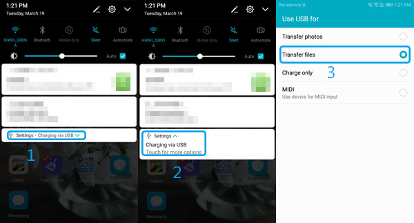 Nach dem Anschließen des Handys an den Computer wird es möglicherweise aufgeladen. Ändern Sie den Lademodus in "Datei übertragen". Streichen Sie den Bildschirm nach unten. Wenn Sie die Meldung "Aufladen über USB" angezeigt wird, tippen Sie darauf. Auf dem Popup-Fenster klicken Sie auf "Datei übertragen".