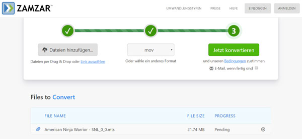 Zamzar ist ein effektives und einfaches Online-Videokonvertierungs-Tool. Es ermöglicht Ihnen, MTS-Datei in MOV für Final Cut Pro zu konvertieren. Unten schauen Sie die einfache Schritte dazu.