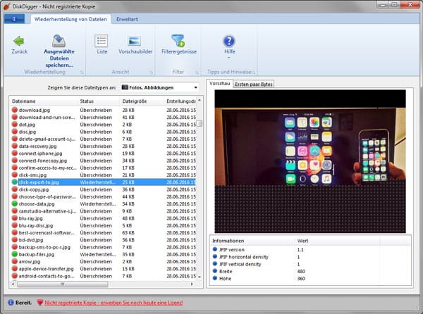 2. Bei der Vorschau der gescannten Datei können Sie konkrete Informationen sehen. Zum Beispiel, wenn Sie Thumbnail von einem JPG bekommen, können Sie EXIF-Infos inkl. Kameramodell, Aufnahmedatum und Sensor-Einstellungen finden.