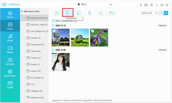 Wählen Sie die Dateien aus, die Sie klonen möchten. Klicken Sie in der oberen Symbolleiste auf "Aufs Gerät übertragen". Wählen Sie Ihr neues Xiaomi 11 als Ausgabegerät. Jetzt können Sie Daten in wenigen Minuten selektiv oder vollständig vom alten-Xiaomi auf neues übertragen.